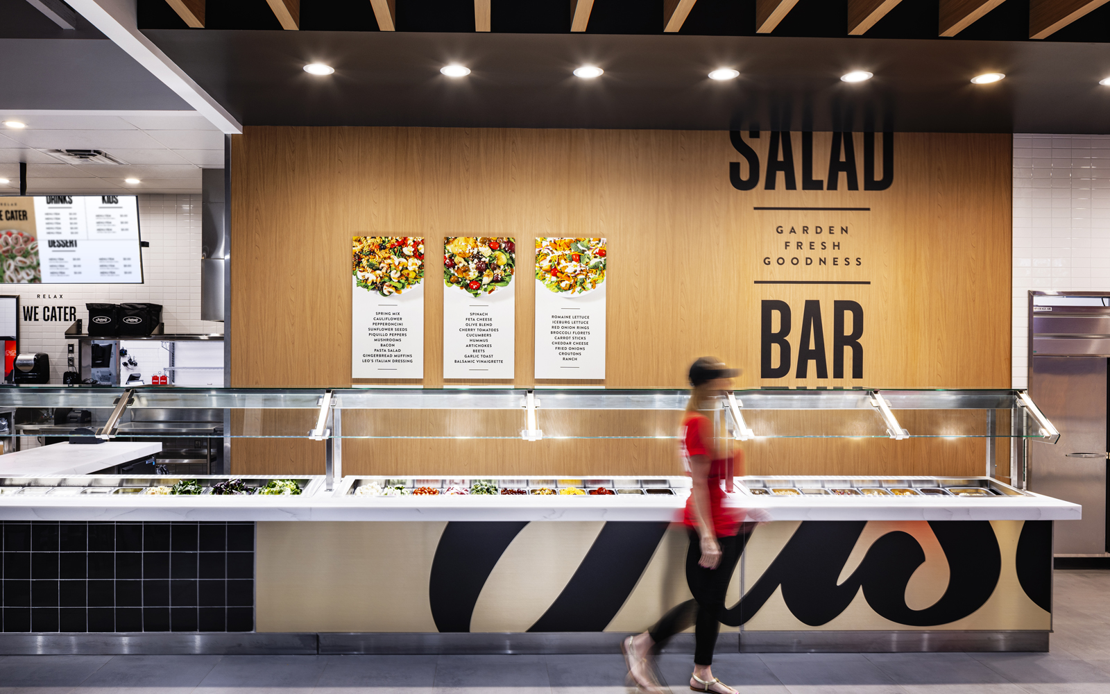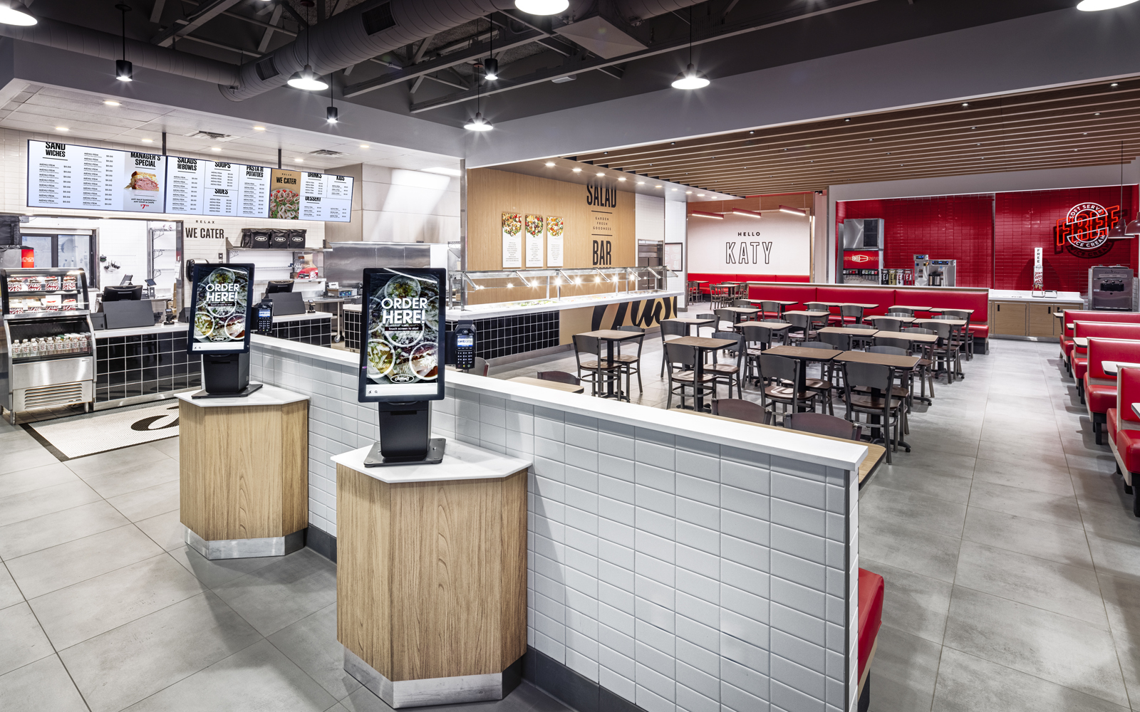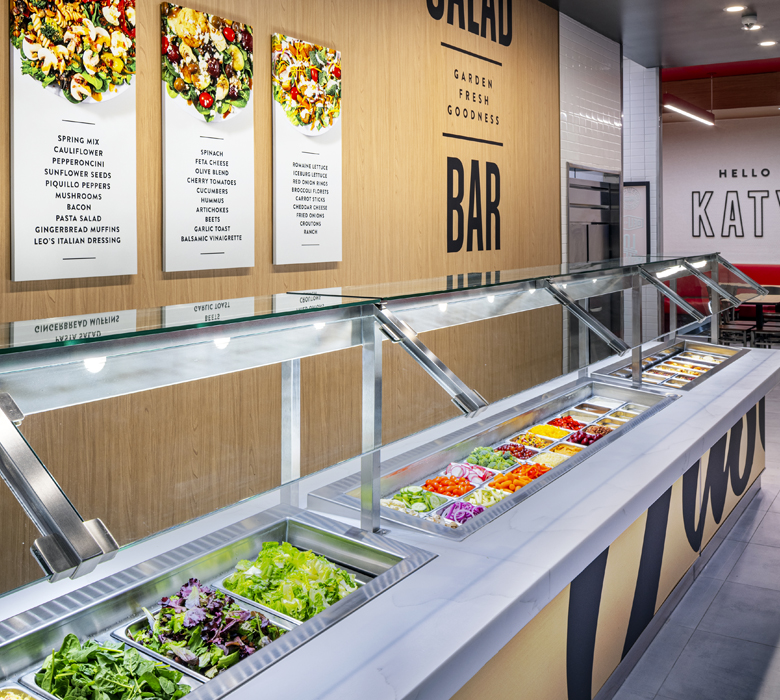We then brought the updated identity to life in a new restaurant prototype with a more intuitive customer journey. To serve customers with greater convenience and flexibility, the modern layout introduces a host of new features, including digital kiosks and a more convenient salad bar that takes center stage. The environment now enhances the customer experience while staying true to its classic-deli roots.